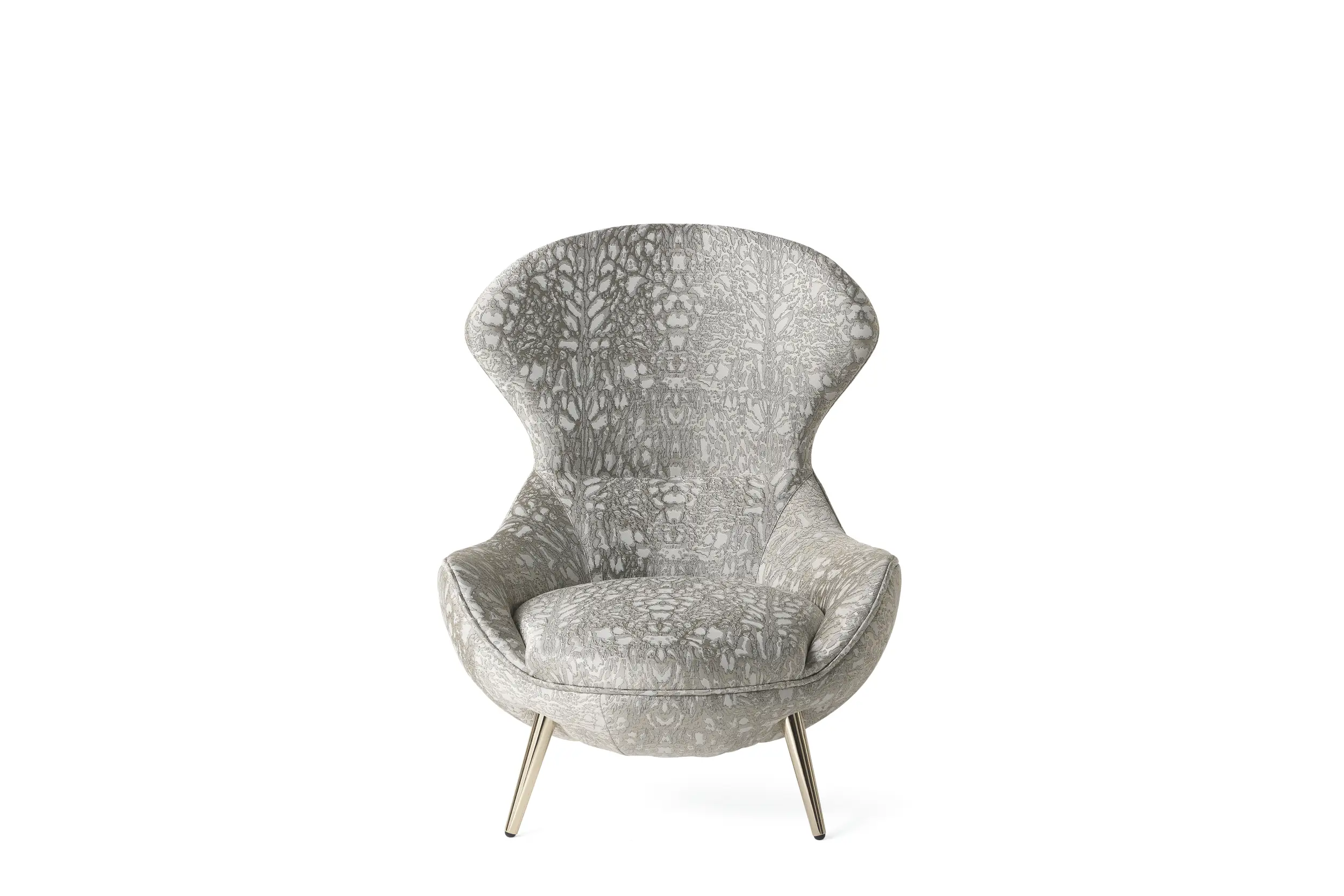 A dynamic and embracing shape with sinuous lines for the Curaçao bergere. With four sloping legs recalling the Fifties, it is available in different fabrics of the collection.
