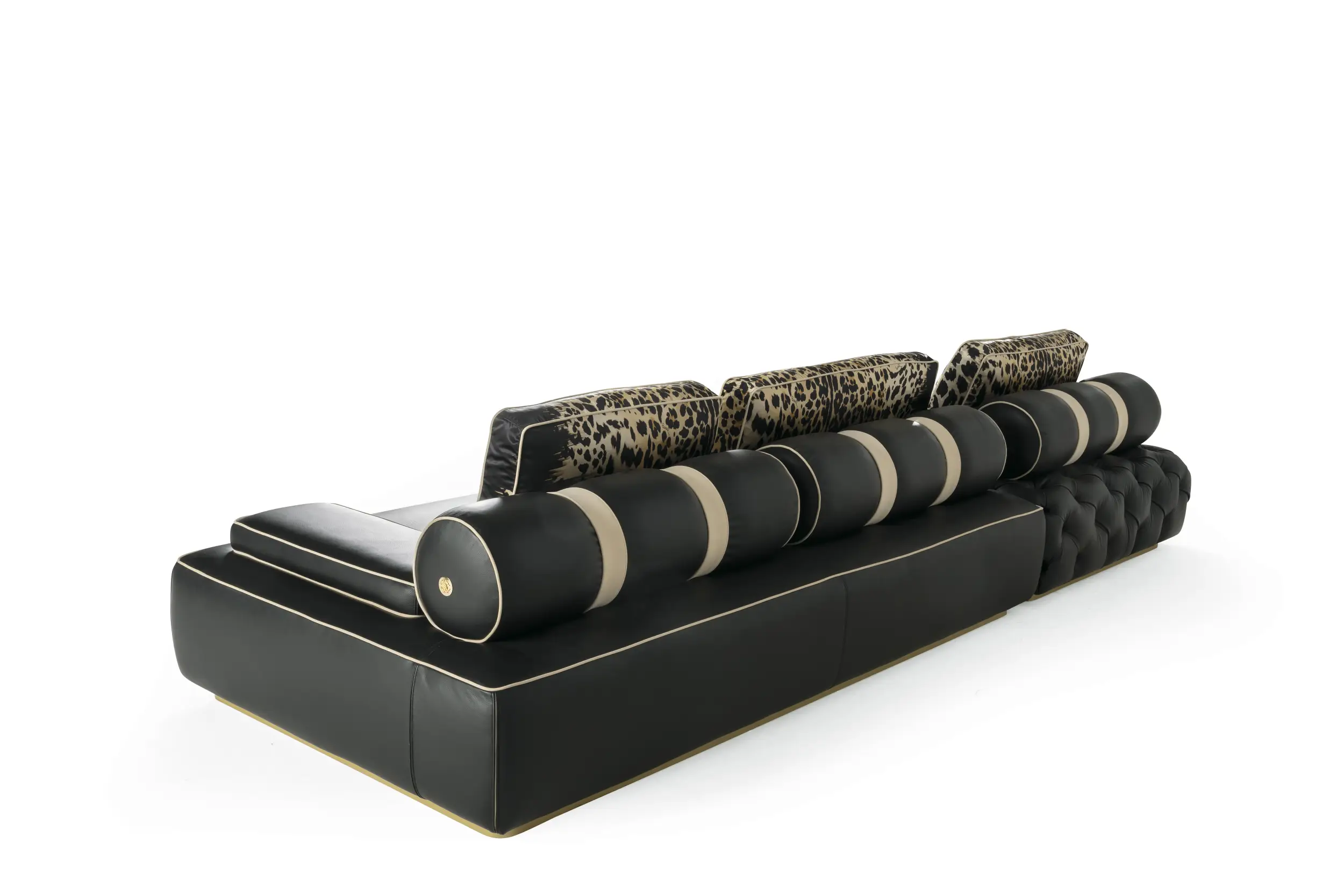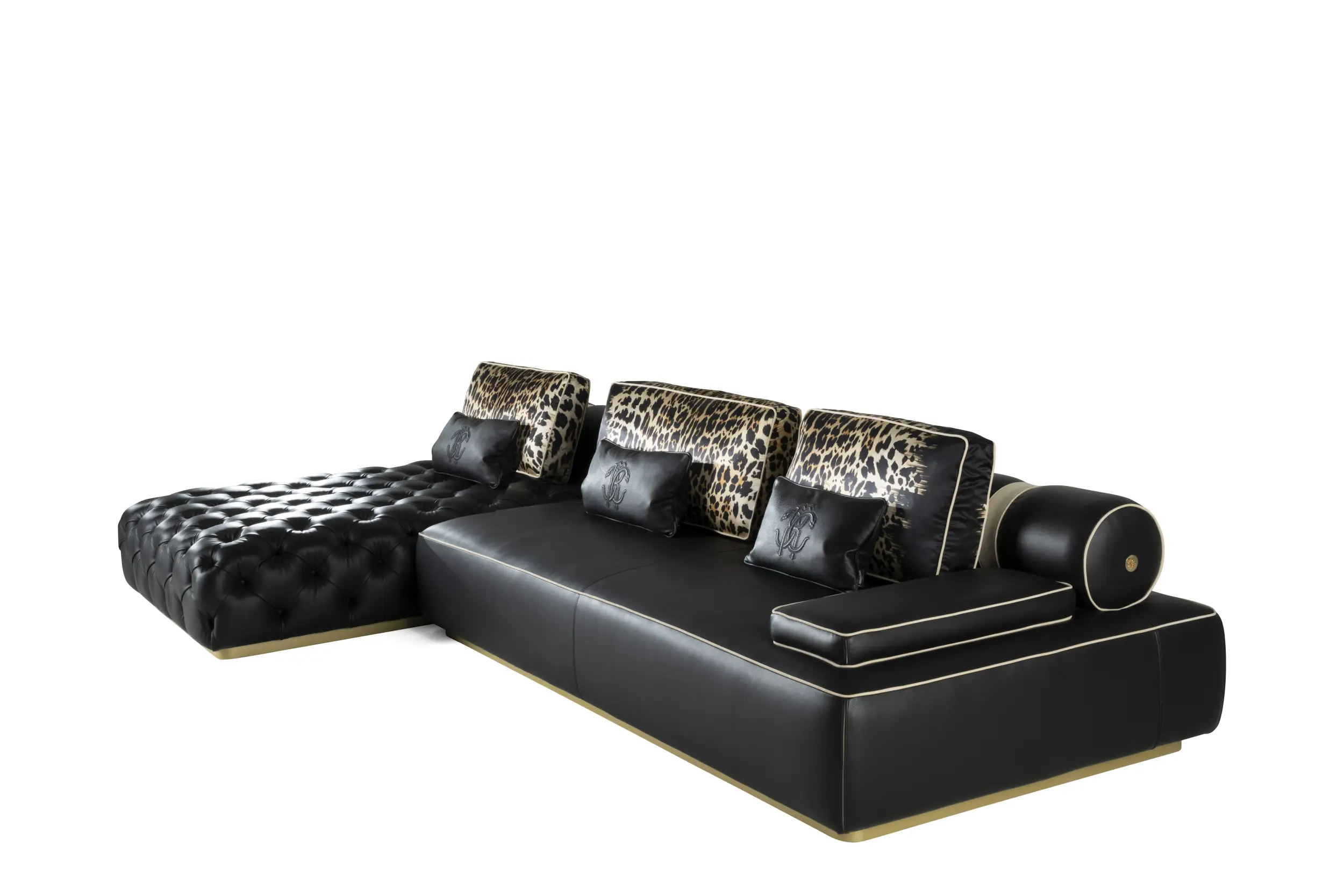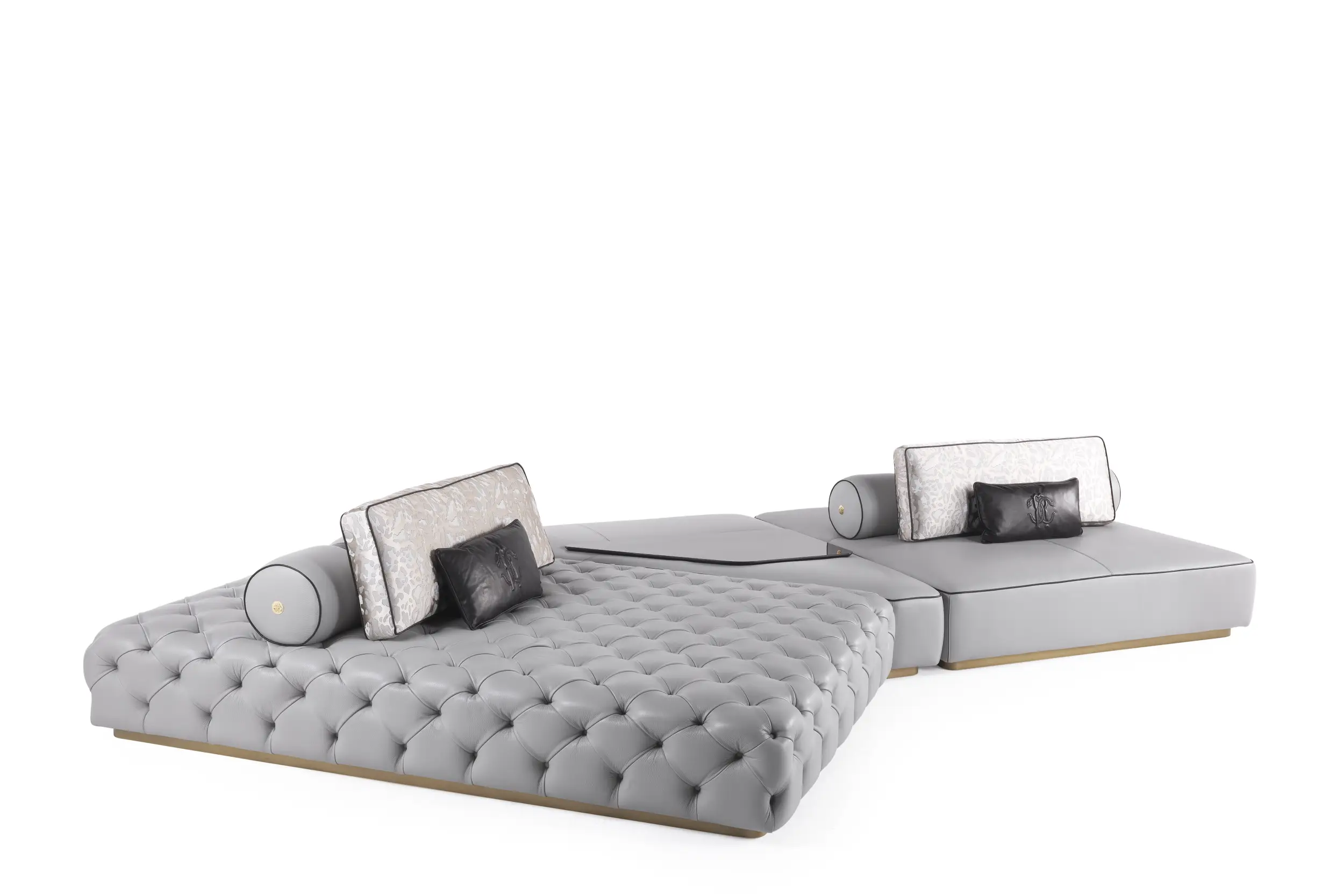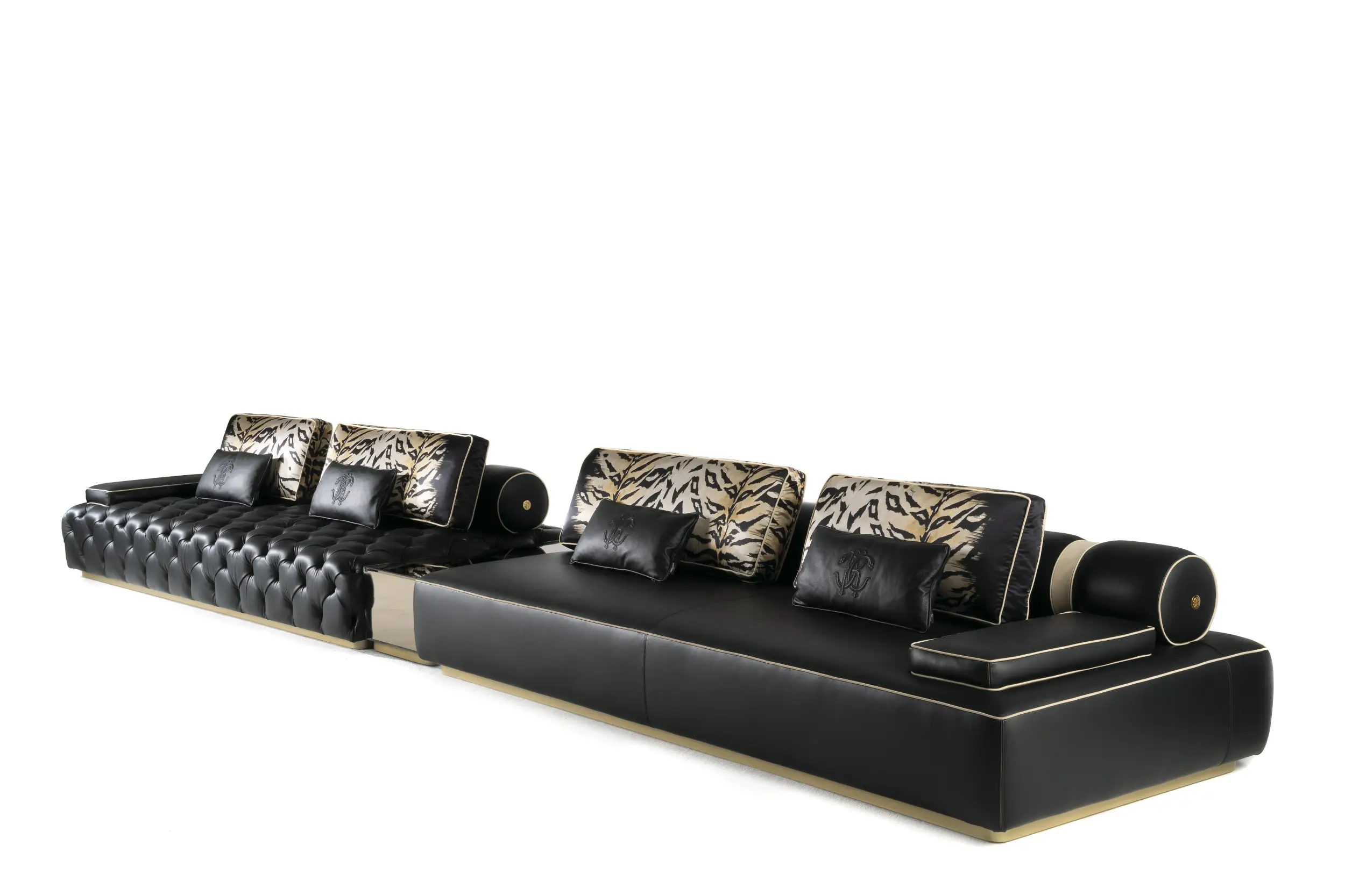 Darlington Low is an iconic sectional sofa of the Roberto Cavalli Home Interiors collection, characterized by a refined capitonné finishing. The sofa is available in different versions, all perfectly representing the brand’s sensual and bold character, and is completed by cushions with wild animal patterns.