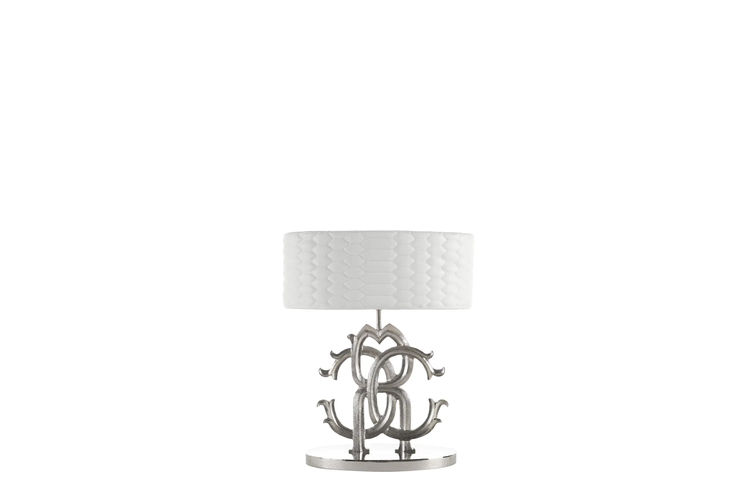 Logo is the iconic line of table lamps signed by Roberto Cavalli Home Interiors. Each lamp features a cast brass base shaped like the Roberto Cavalli monogram, available in gold or silver, and a lampshade in various fabrics or leathers from the collection.