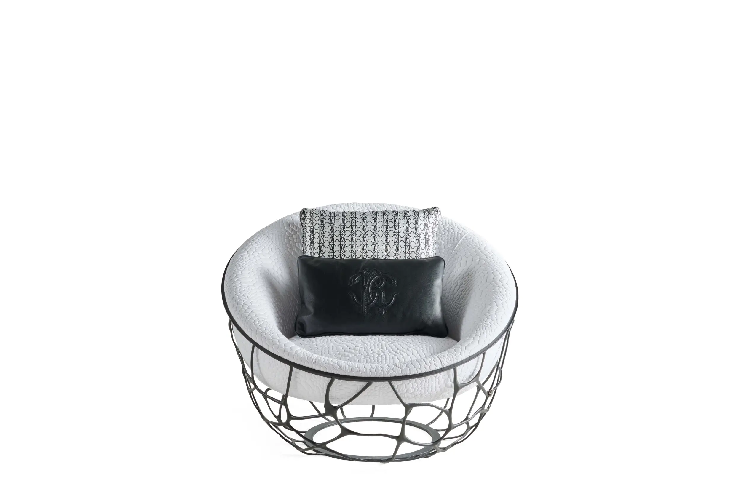 The refined processing of the base, a precious asymmetrical grille with hand-chiselled brass castings, is the distinguishing feature of the Sioraf line. At the crossroads between art and design, the Sioraf armchair blends into the home with class and elegance, enhancing it with the collection's fabrics and leathers that cover the seat.