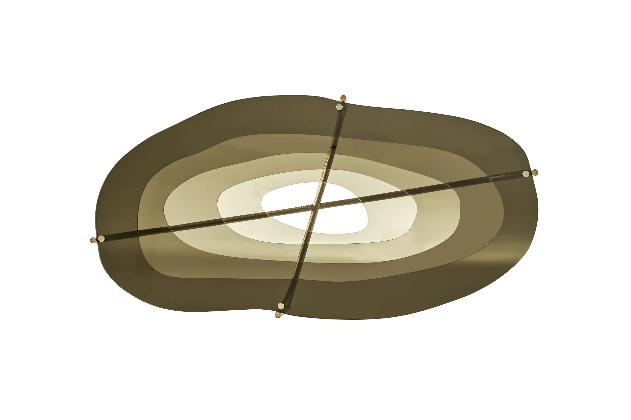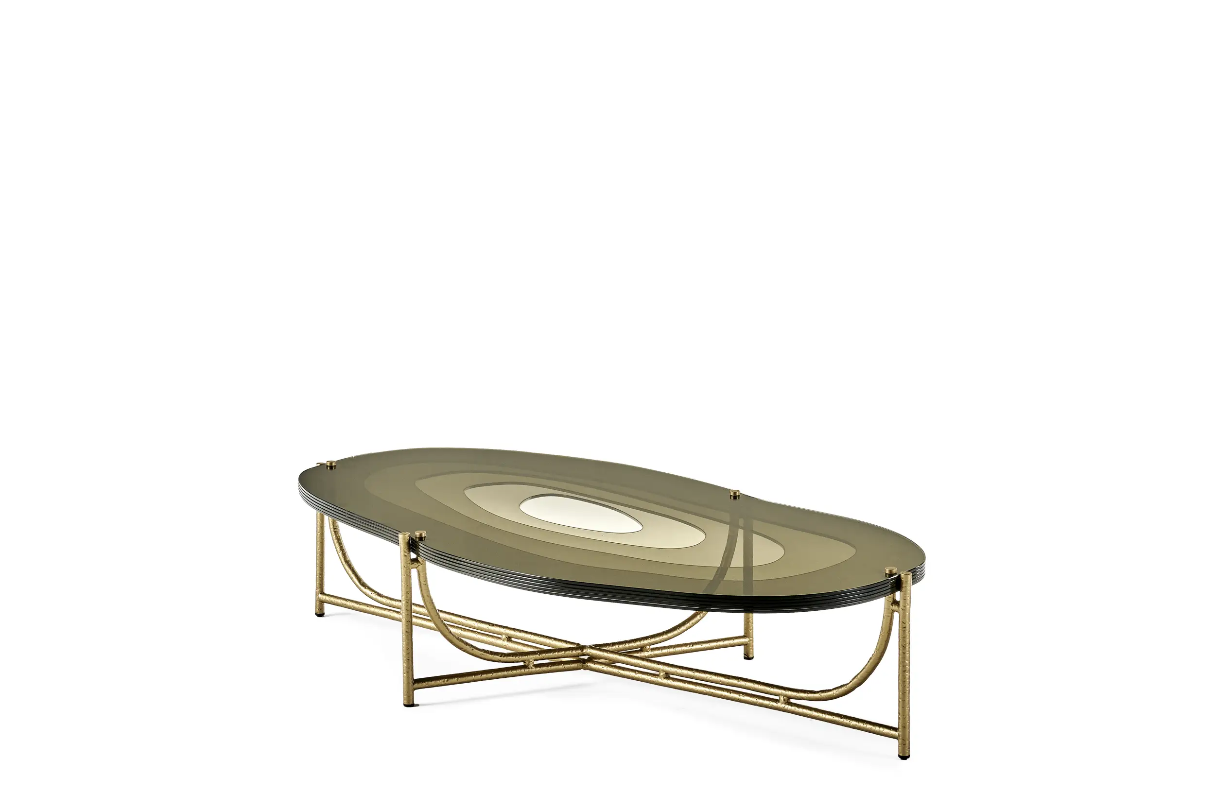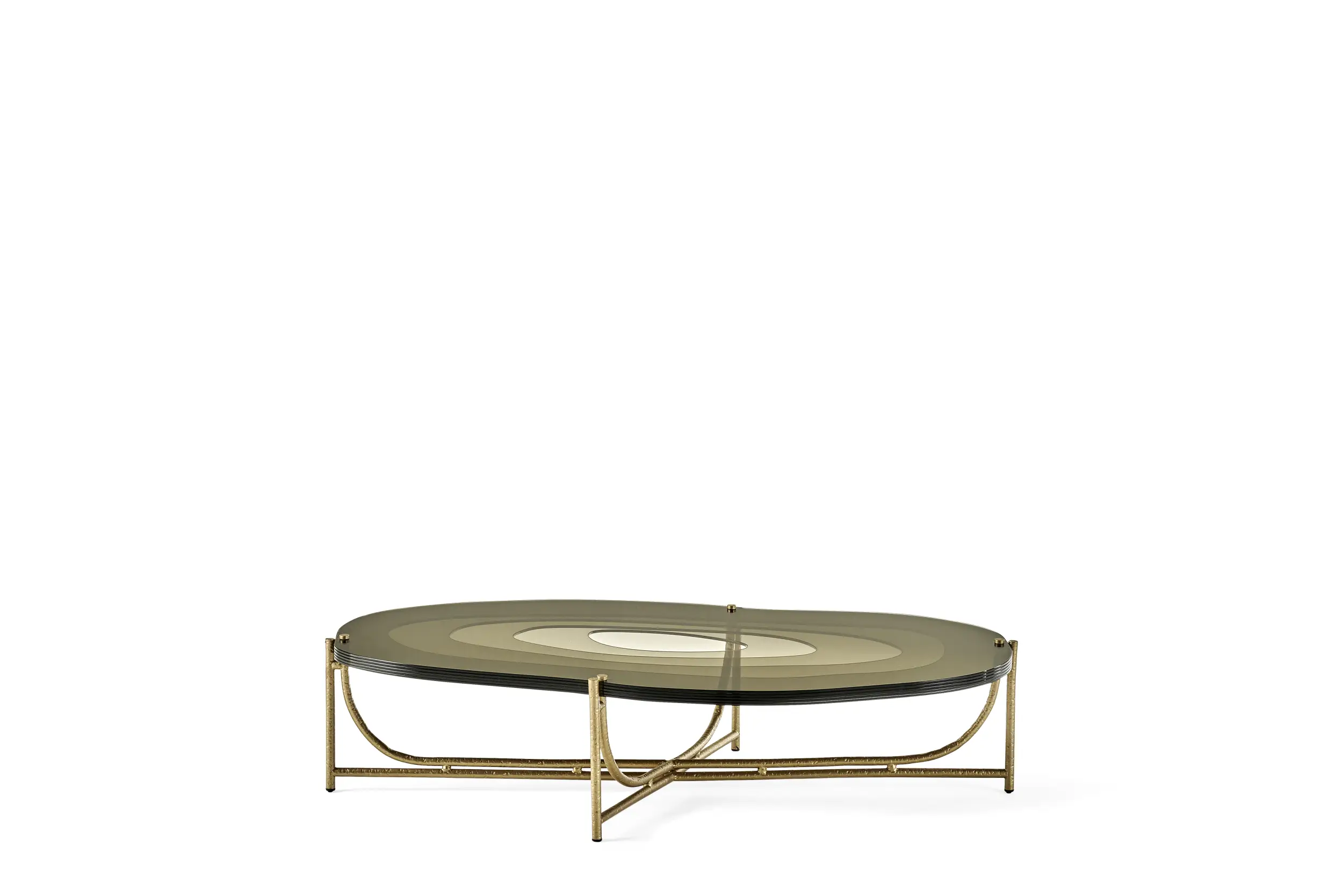 The Tahoe low tables explore an artful dialogue between light and material, playing on the contrast between transparencies and metallic finishes. The top, composed of concentric layers of glass, creates a captivating depth effect where reflections turn into enchanting colour plays. Enhancing the overall design, the golden structure features a textured finish that adds warmth and character.