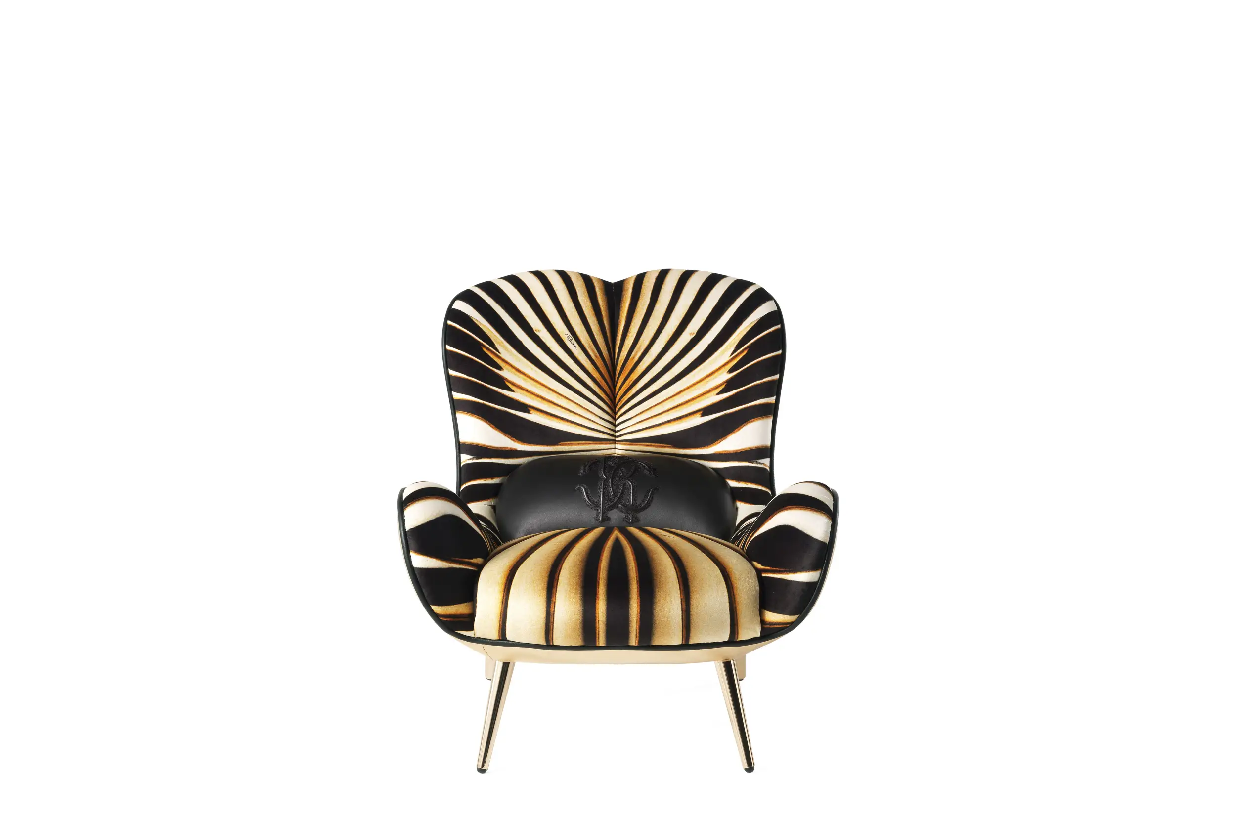 Soft shapes and exotic suggestions for the Tifnit armchair. The upholstery, with the typical fabrics featuring iconic animal patterns, lends the piece of furniture a wild and sensual spirit. The external structure upholstered in leather lends a gritty allure to the whole, while the glossy gold feet give a bright, luxurious and glamorous accent.