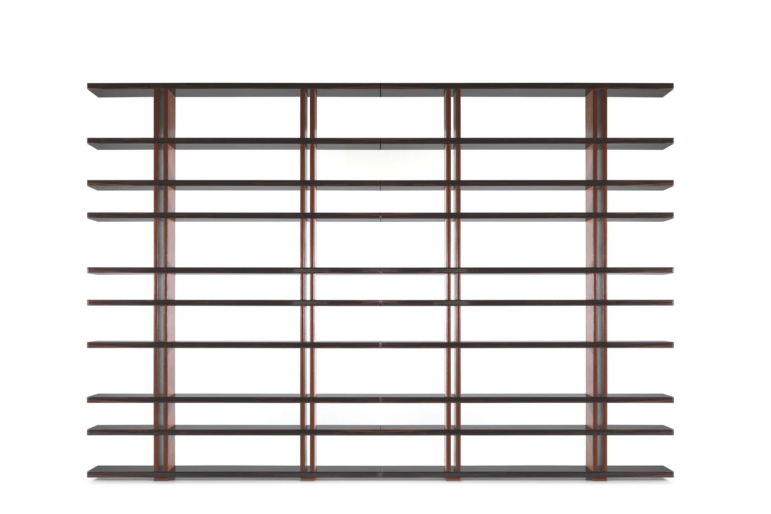Pillars covered in leather from the collection. Shelves veneered in glossy Oak Dyed Wengé, Grey/Rose Carbalho or Eucalyptus frisé.